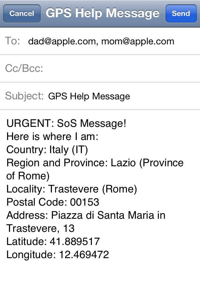 GPS Help is firstly aimed at helping all the people needing of transmitting their actual geographical position. In particular, by relying on all the GPS features of your Apple device, you will be enabled to send to your selected contacts your last location (e.g. address, town, city, country and other) via E-Mail either SMS.