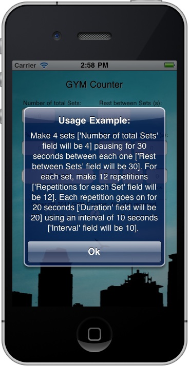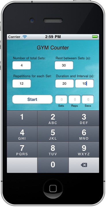 GYM Counter can be adopted by trainers as well as by whose wanting to perform exercises at home reading a book or watching TV: while dedicated counters (Sets, Repetitions and Seconds) go on, a voice will alert you when you have to be ready to start, when you have to start each set or repetition and when you have to stop as well. You have not to worry about nothing else than setup properly your assistant filling in GYM Counter, at the beginning, the 5 auto-explicative fields as follows: